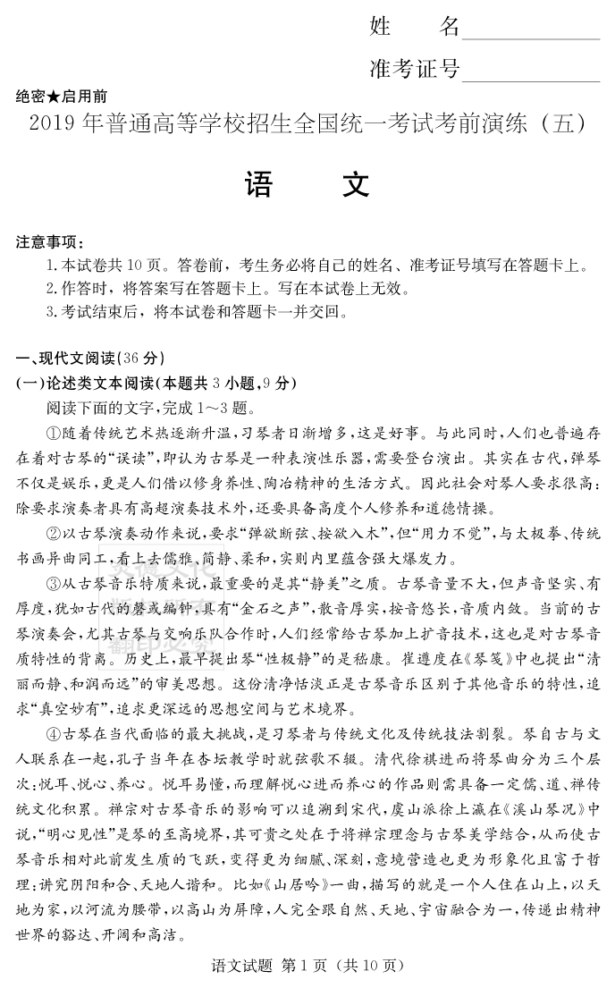【語文】2019年普通高等學(xué)校招生全國統(tǒng)一考試考前演練(五)