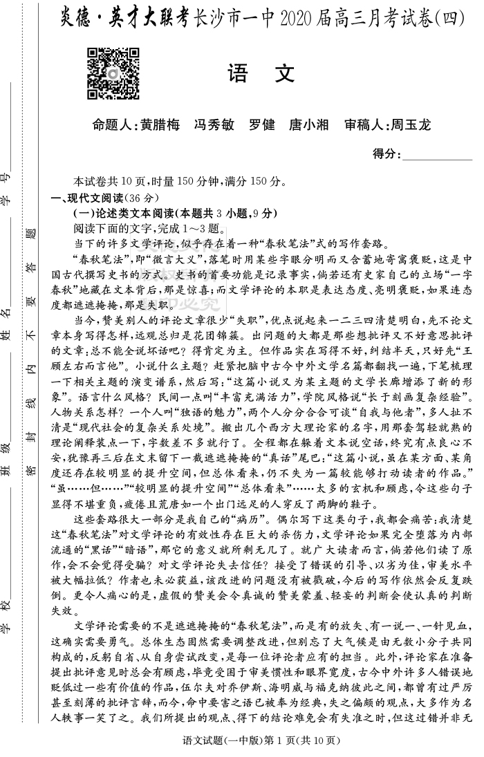 【語文】炎德英才大聯(lián)考2020屆長沙市一中高三4次月考