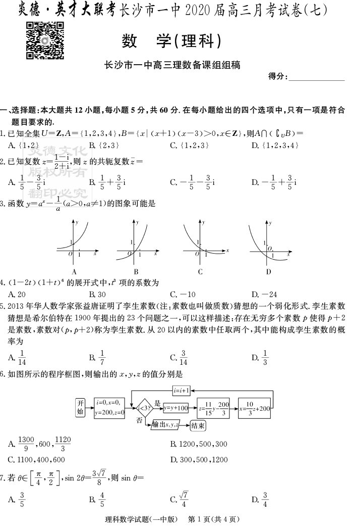 【理數(shù)】炎德英才大聯(lián)考2020屆長沙市一中高三7次月考