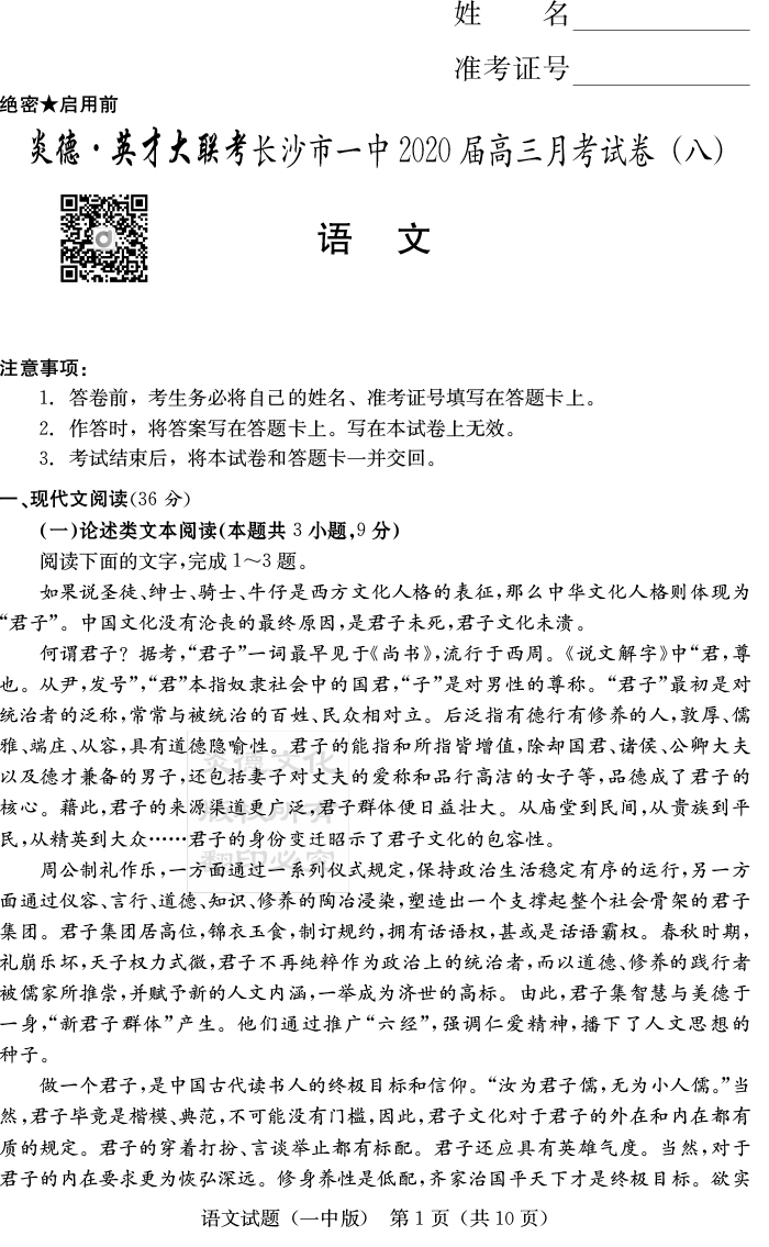 【語文】炎德英才大聯考2020屆長沙市一中高三8次月考
