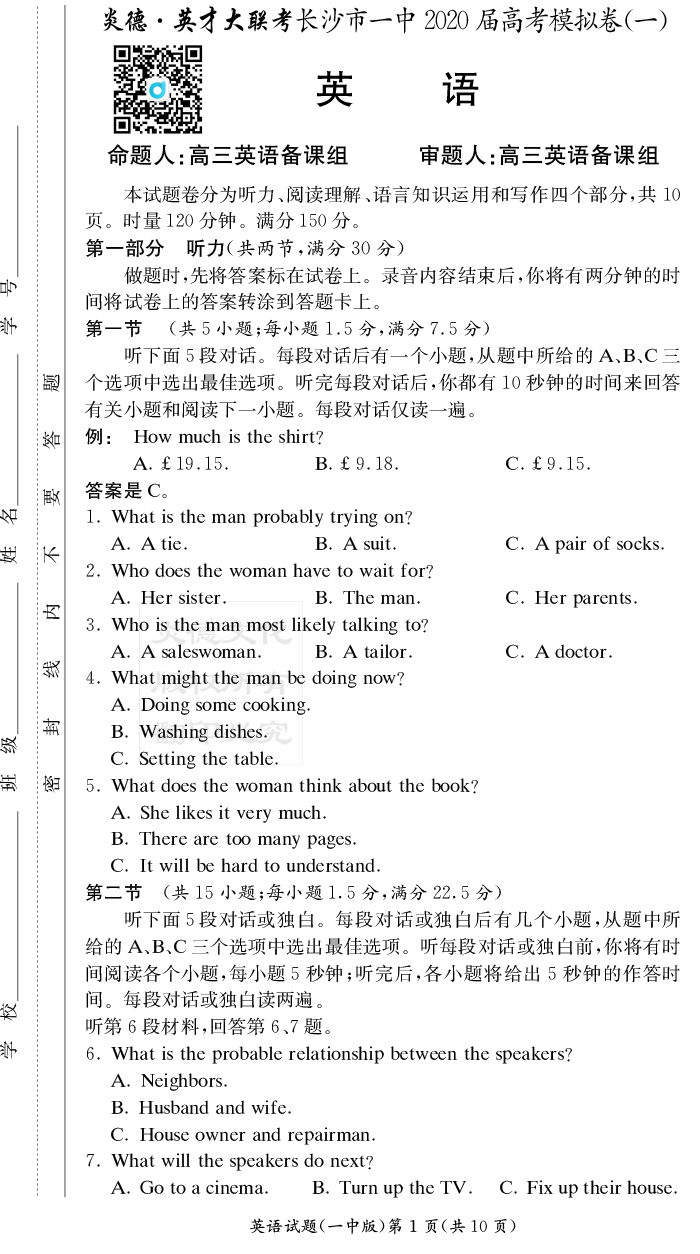 【英語(yǔ)】炎德英才大聯(lián)考2020屆長(zhǎng)沙市一中高三9次月考(模擬一)
