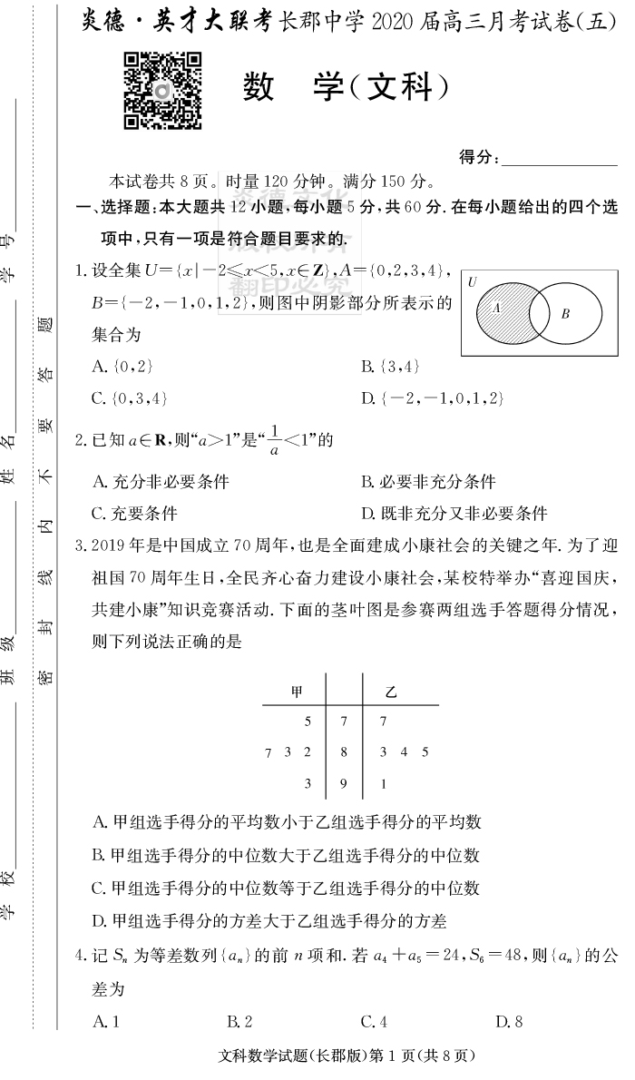 【文數(shù)】炎德英才大聯(lián)考2020屆長(zhǎng)郡中學(xué)高三5次月考