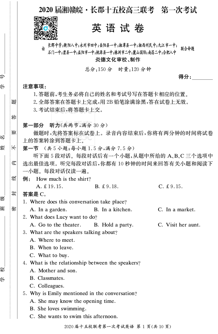 【英語】炎德英才大聯(lián)考2020屆長郡中學(xué)高三7次月考(十五校聯(lián)考一)