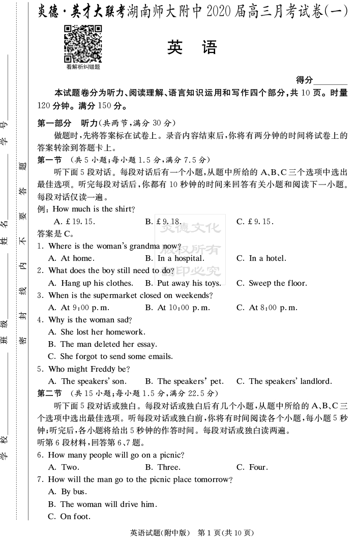 【英語(yǔ)】炎德英才大聯(lián)考2020屆師大附中高三1次月考