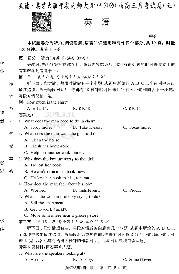 【英語】炎德英才大聯(lián)考2020屆師大附中高三5次月考