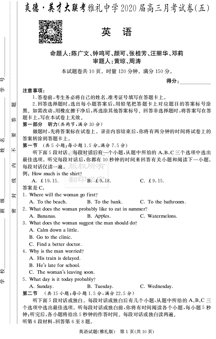 【英語(yǔ)】炎德英才大聯(lián)考2020屆雅禮中學(xué)高三5次月考