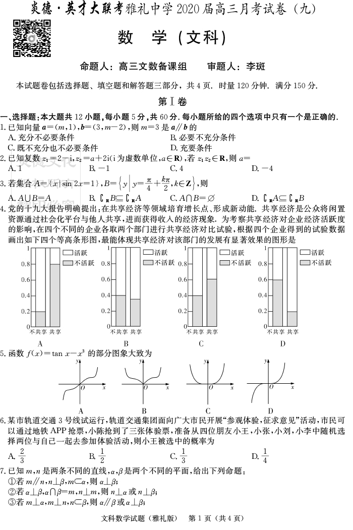 【文數(shù)】炎德英才大聯(lián)考2020屆雅禮中學(xué)高三9次月考