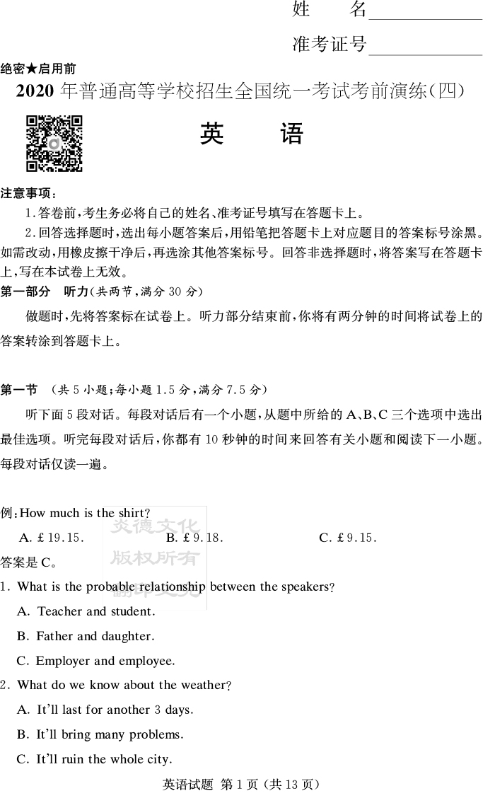 【英語】2020年普通高等學(xué)校招生全國統(tǒng)一考試考前演練(四)