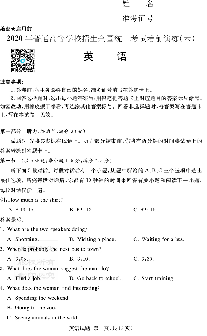 【英語(yǔ)】2020年普通高等學(xué)校招生全國(guó)統(tǒng)一考試考前演練(六)