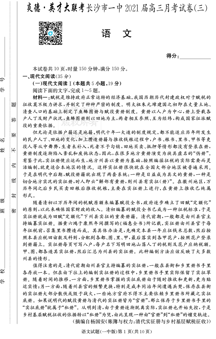 【語文】炎德英才大聯(lián)考2021屆長沙市一中高三3次月考