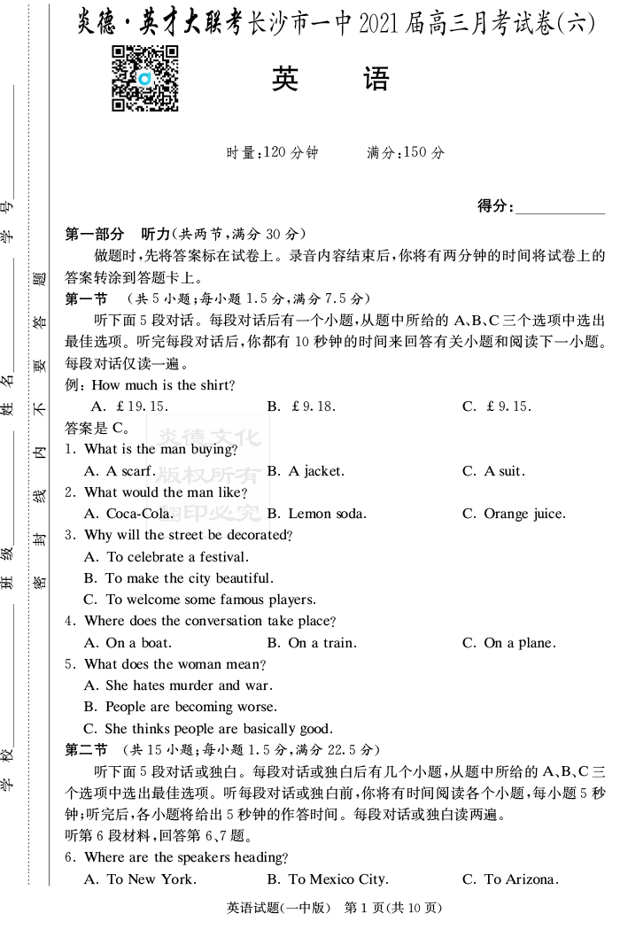 【英語】炎德英才大聯(lián)考2021屆長沙市一中高三6次月考