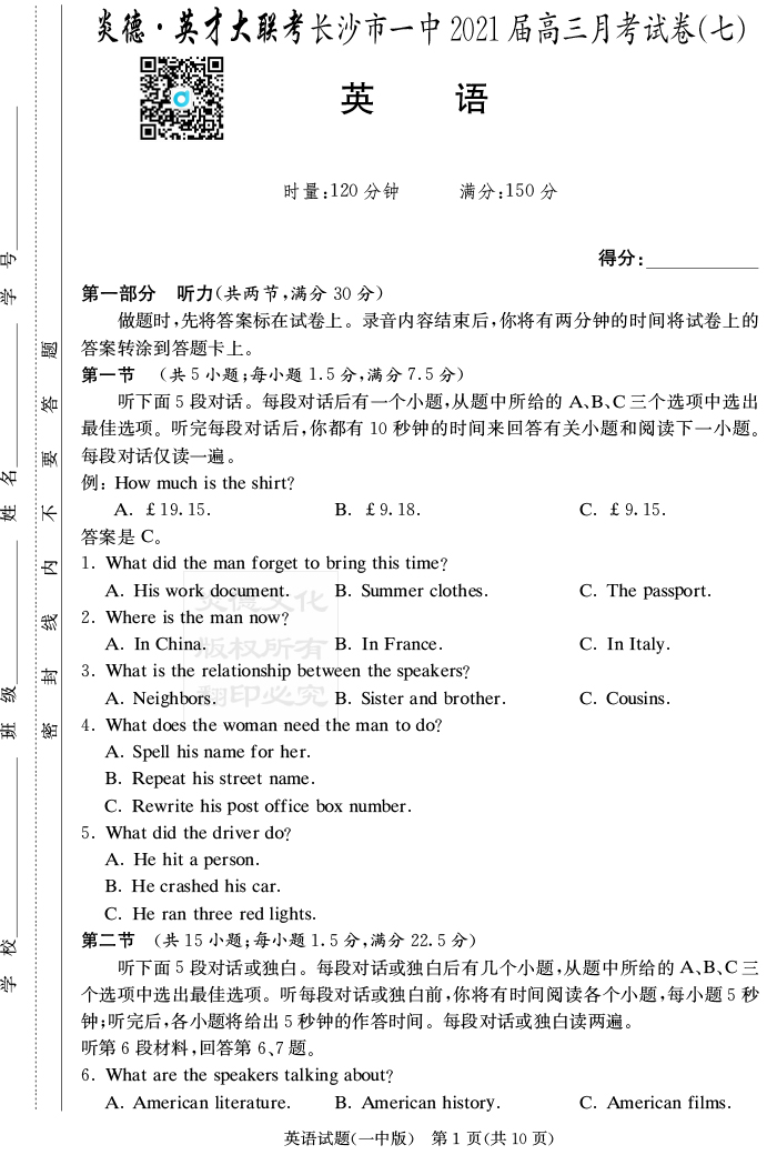 【英語(yǔ)】炎德英才大聯(lián)考2021屆長(zhǎng)沙市一中高三7次月考