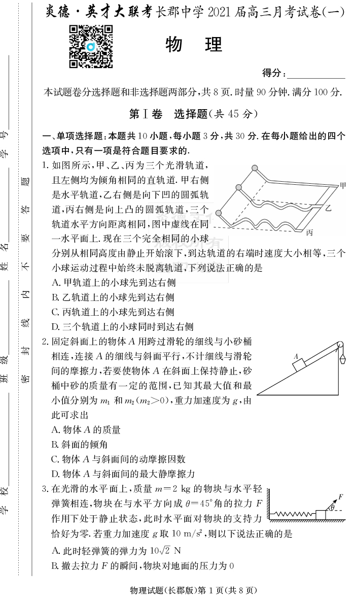 【物理】炎德英才大聯(lián)考2021屆長(zhǎng)郡中學(xué)高三1次月考