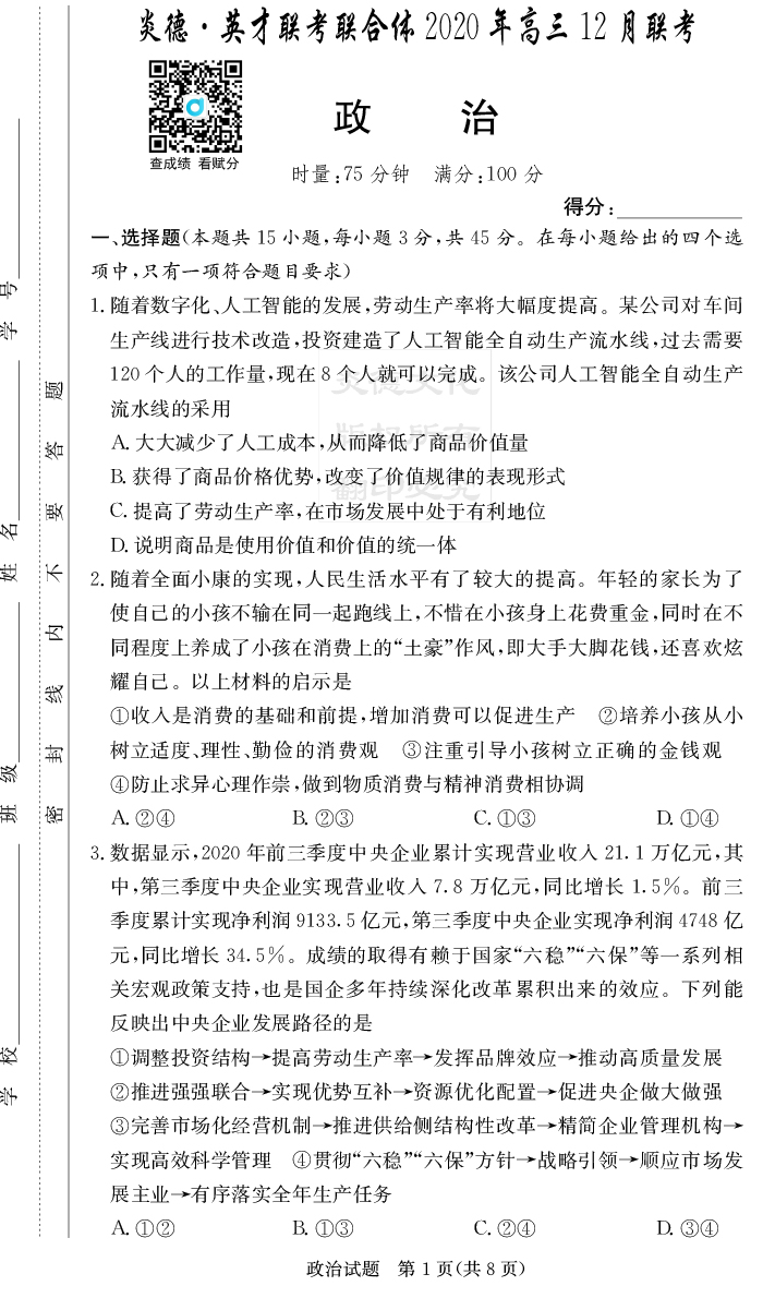 2026年高中寒假作業(yè)自主學習作業(yè)本·高三年級·政治