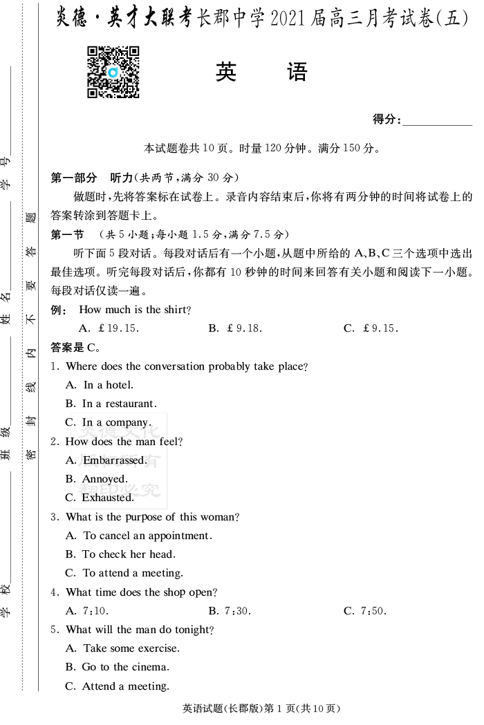 【英語】炎德英才大聯(lián)考2021屆長郡中學(xué)高三5次月考