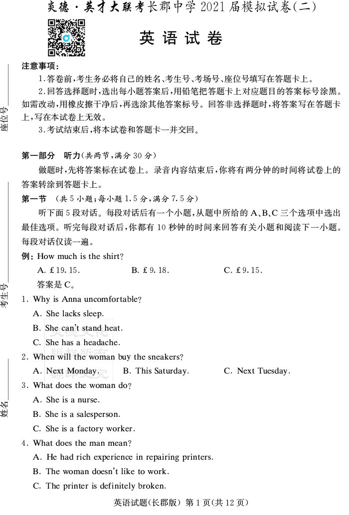 【英語(yǔ)】炎德英才大聯(lián)考2021屆長(zhǎng)郡中學(xué)高三10次月考(模擬二)