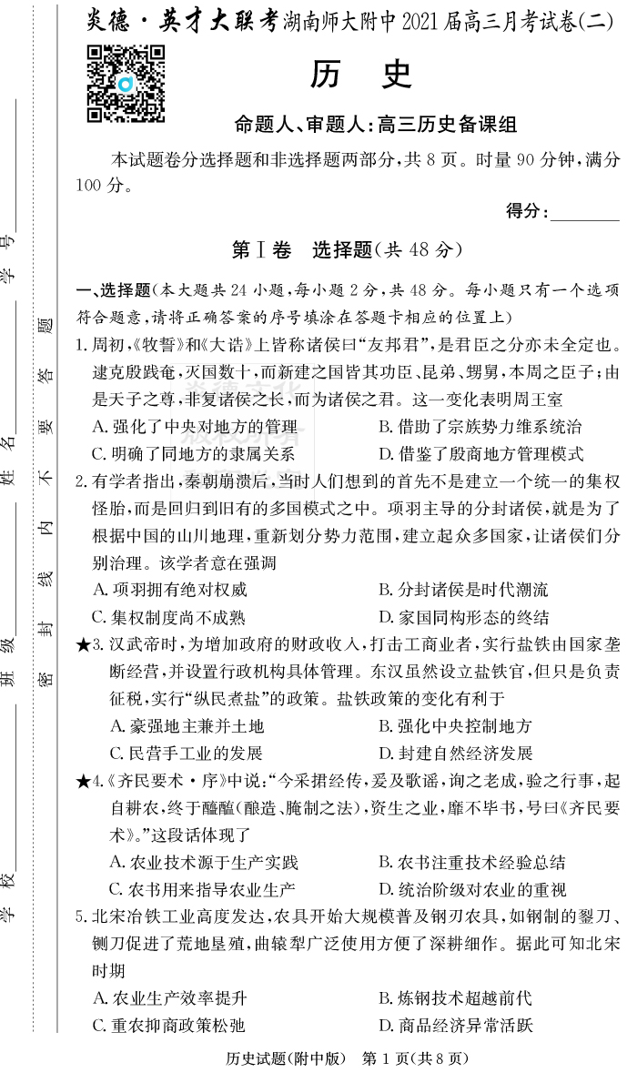 2026湖南師大附中新高考考前小題訓練·歷史