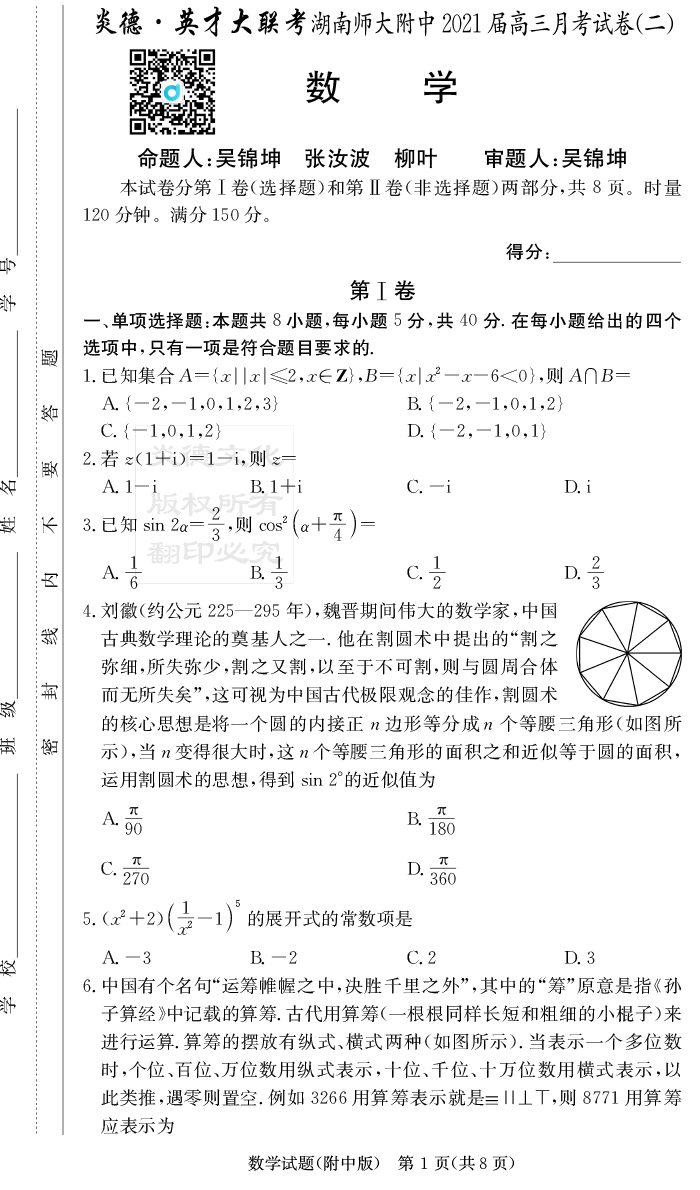 【數(shù)學(xué)】炎德英才大聯(lián)考2021屆湖南師大附中高三2次月考