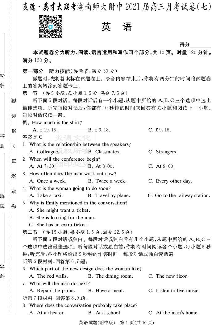 【英語(yǔ)】炎德英才大聯(lián)考2021屆湖南師大附中高三7次月考
