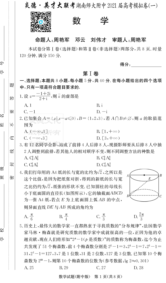 【數(shù)學(xué)】炎德英才大聯(lián)考2021屆湖南師大附中高三8次月考(模擬一)