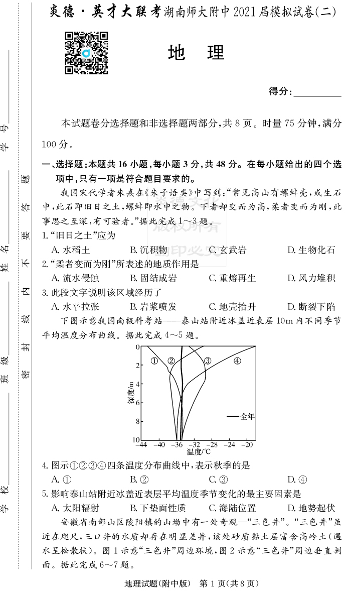 【地理】炎德英才大聯(lián)考2021屆湖南師大附中高三9次月考(模擬二)