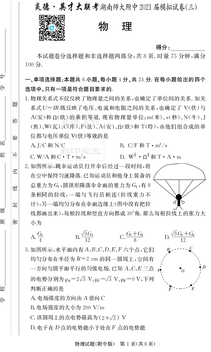 【物理】炎德英才大聯(lián)考2021屆湖南師大附中高三10次月考(模擬三)