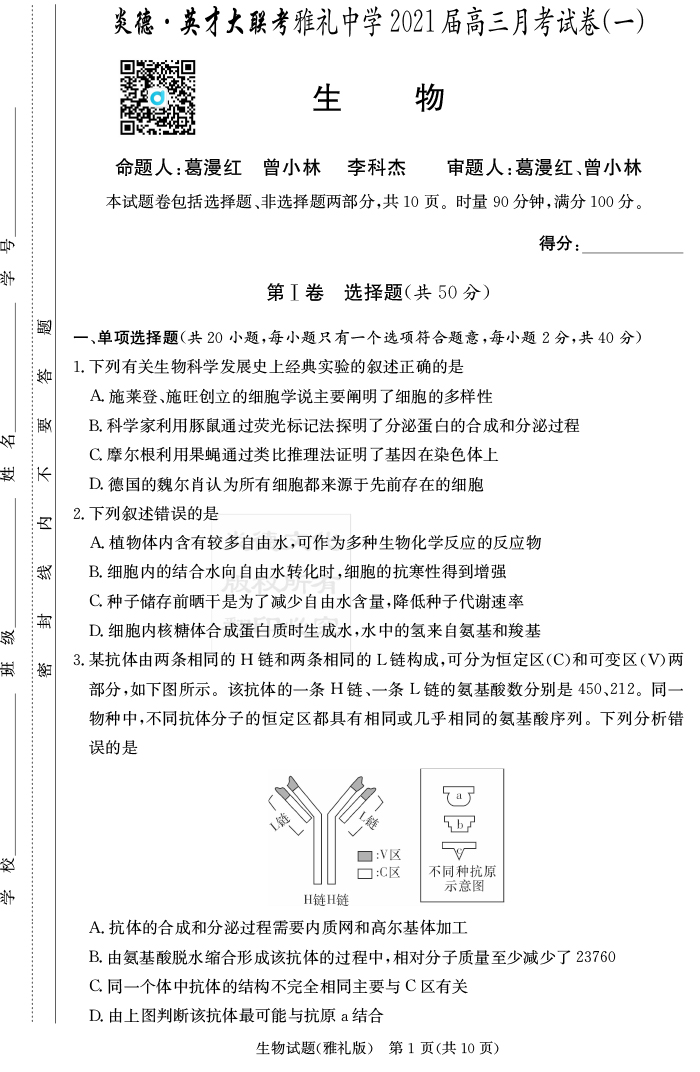 【生物】炎德英才大聯(lián)考2021屆雅禮中學(xué)高三1次月考