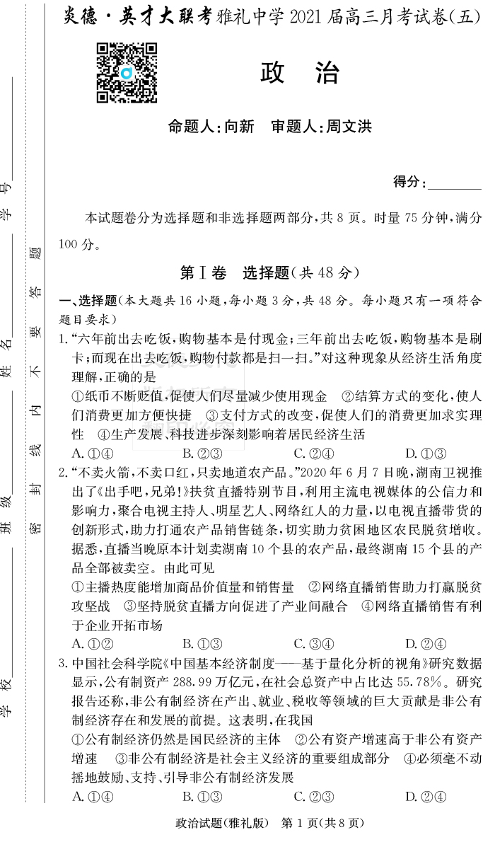 【政治】炎德英才大聯(lián)考2021屆雅禮中學(xué)高三5次月考
