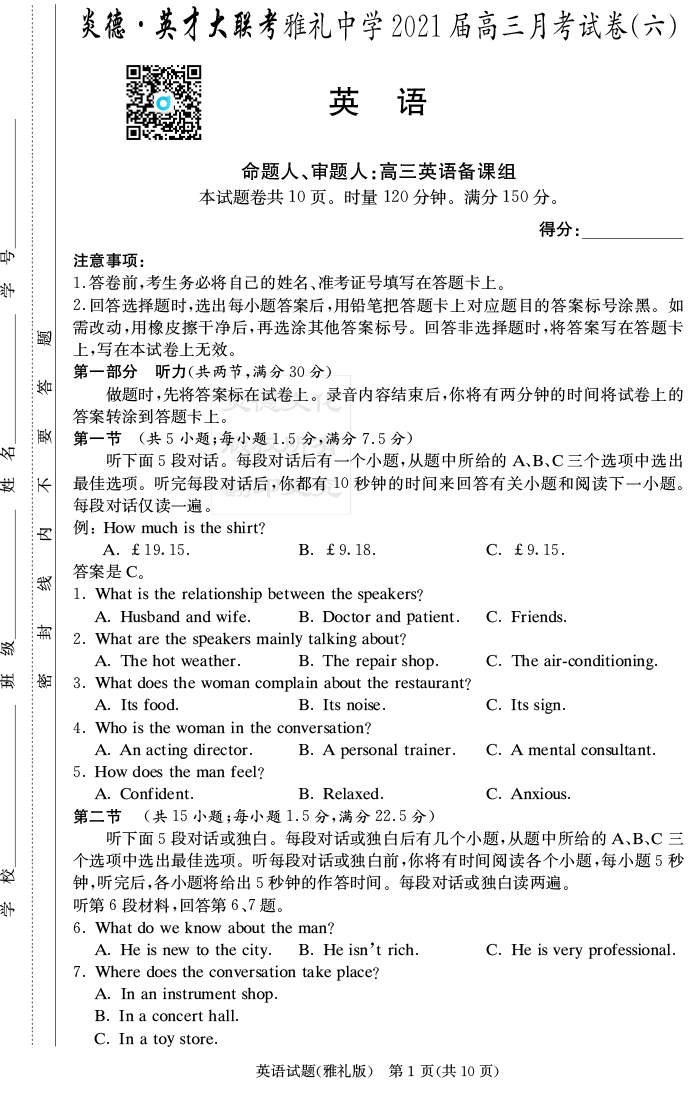 【英語】炎德英才大聯(lián)考2021屆雅禮中學(xué)高三6次月考