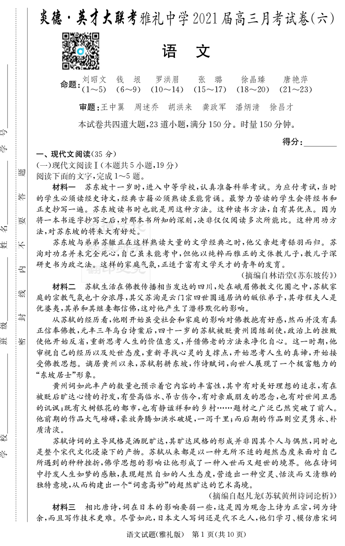 【語(yǔ)文】炎德英才大聯(lián)考2021屆雅禮中學(xué)高三6次月考