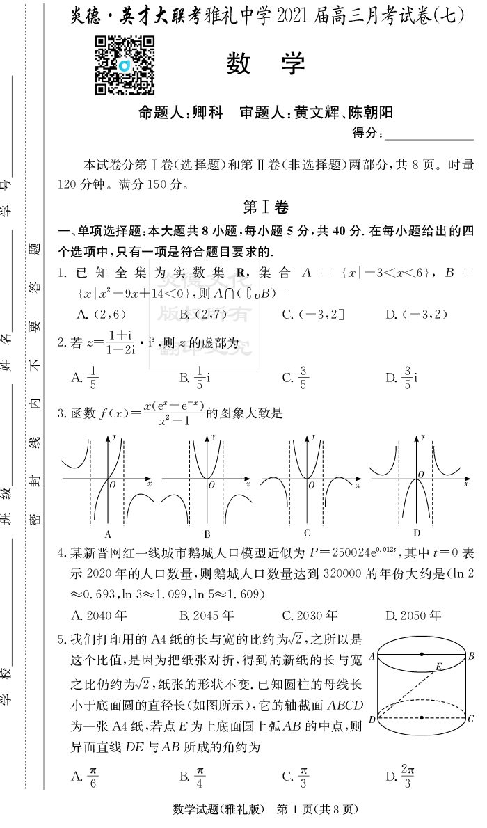 【數(shù)學(xué)】炎德英才大聯(lián)考2021屆雅禮中學(xué)高三7次月考
