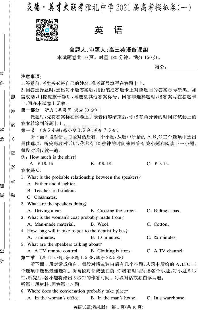 【英語】炎德英才大聯(lián)考2021屆雅禮中學(xué)高三9次月考(模擬一)