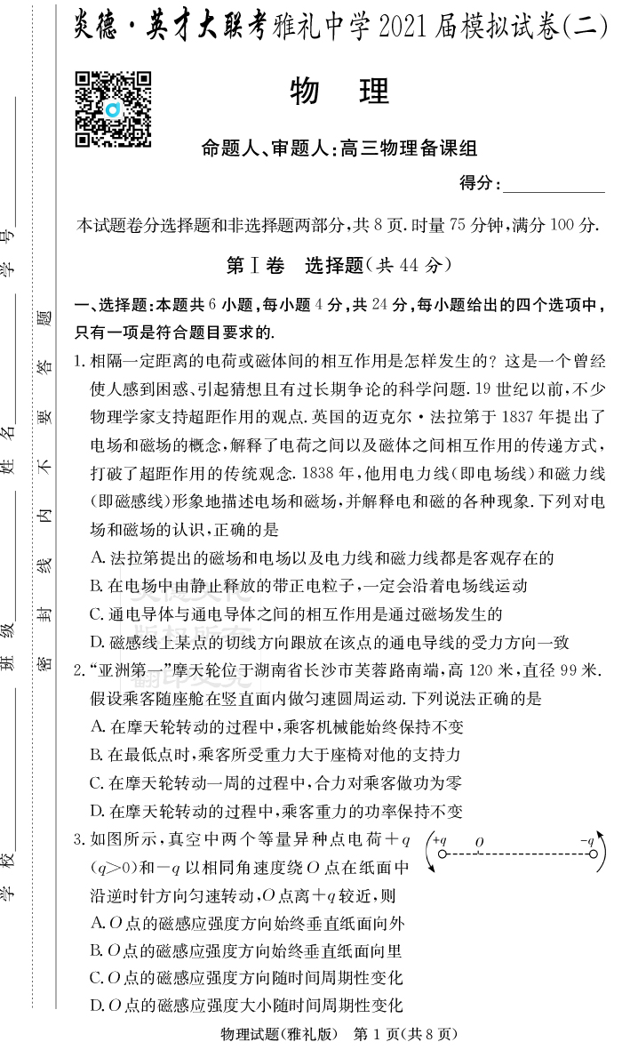 【物理】炎德英才大聯(lián)考2021屆雅禮中學(xué)高三10次月考(模擬二)