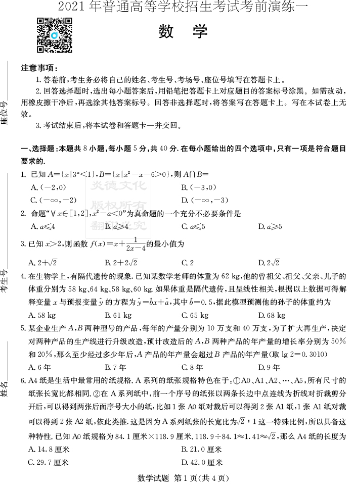 【數(shù)學(xué)】2021年普通高等學(xué)校招生全國(guó)統(tǒng)一考試考前演練(一)