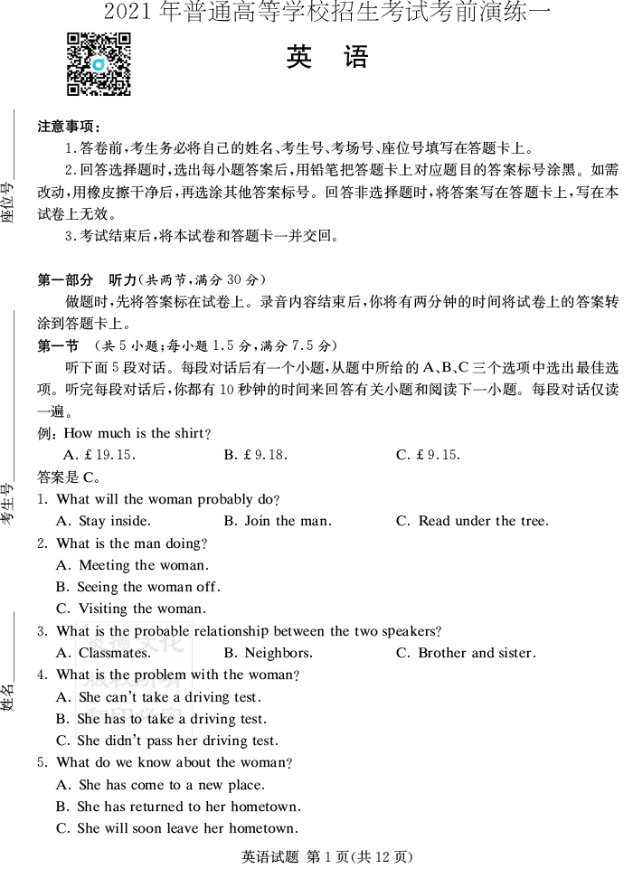 【英語(yǔ)】2021年普通高等學(xué)校招生全國(guó)統(tǒng)一考試考前演練(一)