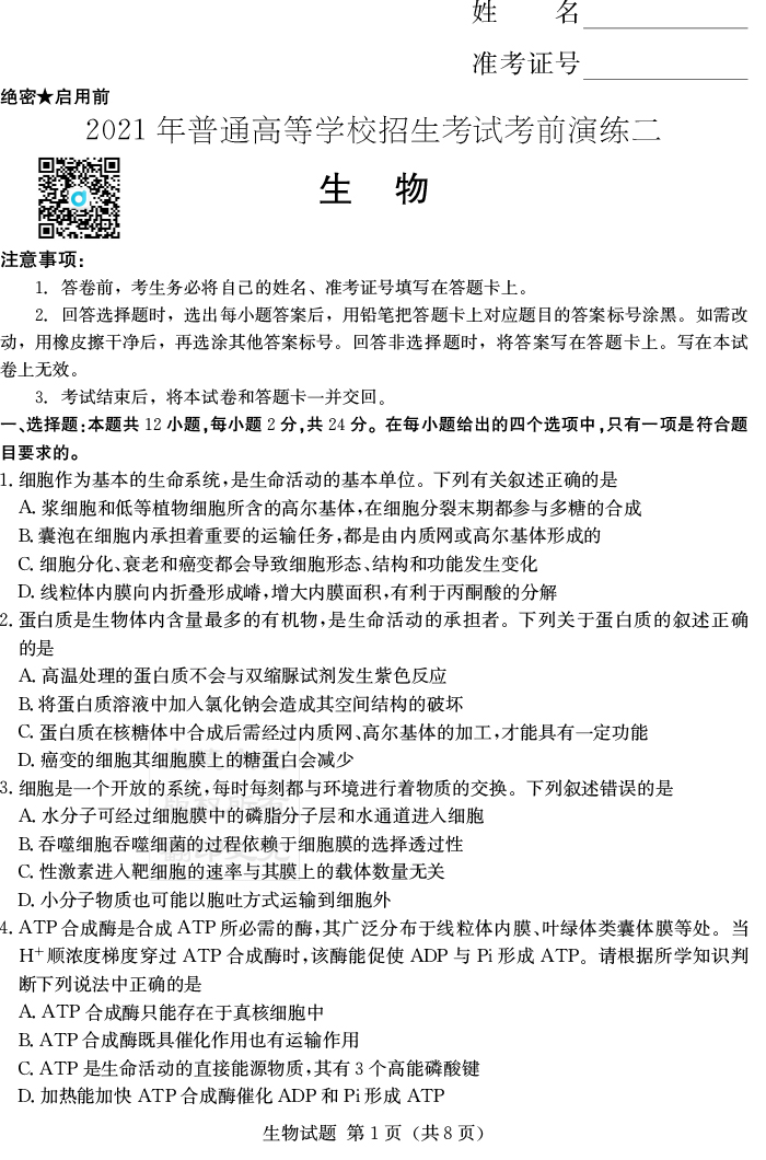 2026年高中寒假作業(yè)自主學習作業(yè)本·高三年級·生物