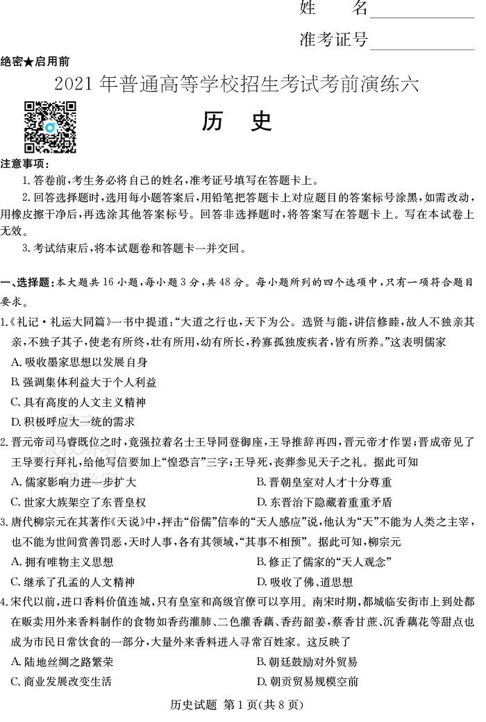 2026年高中寒假作業(yè)自主學習作業(yè)本·高三年級·歷史