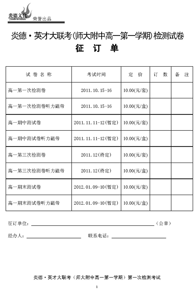炎德英才大聯(lián)考2011年秋季高一高二月考考試時(shí)間及范圍(2011.10-2012.01)