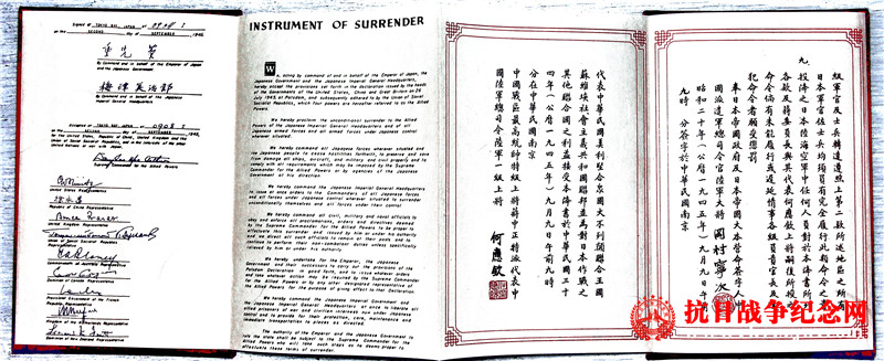 這是英文頒布的天皇的《終戰(zhàn)詔書(shū)》,在東京灣停泊的密蘇里號(hào)戰(zhàn)列艦上簽。(美國(guó)西點(diǎn)軍校陳列的原件照片)