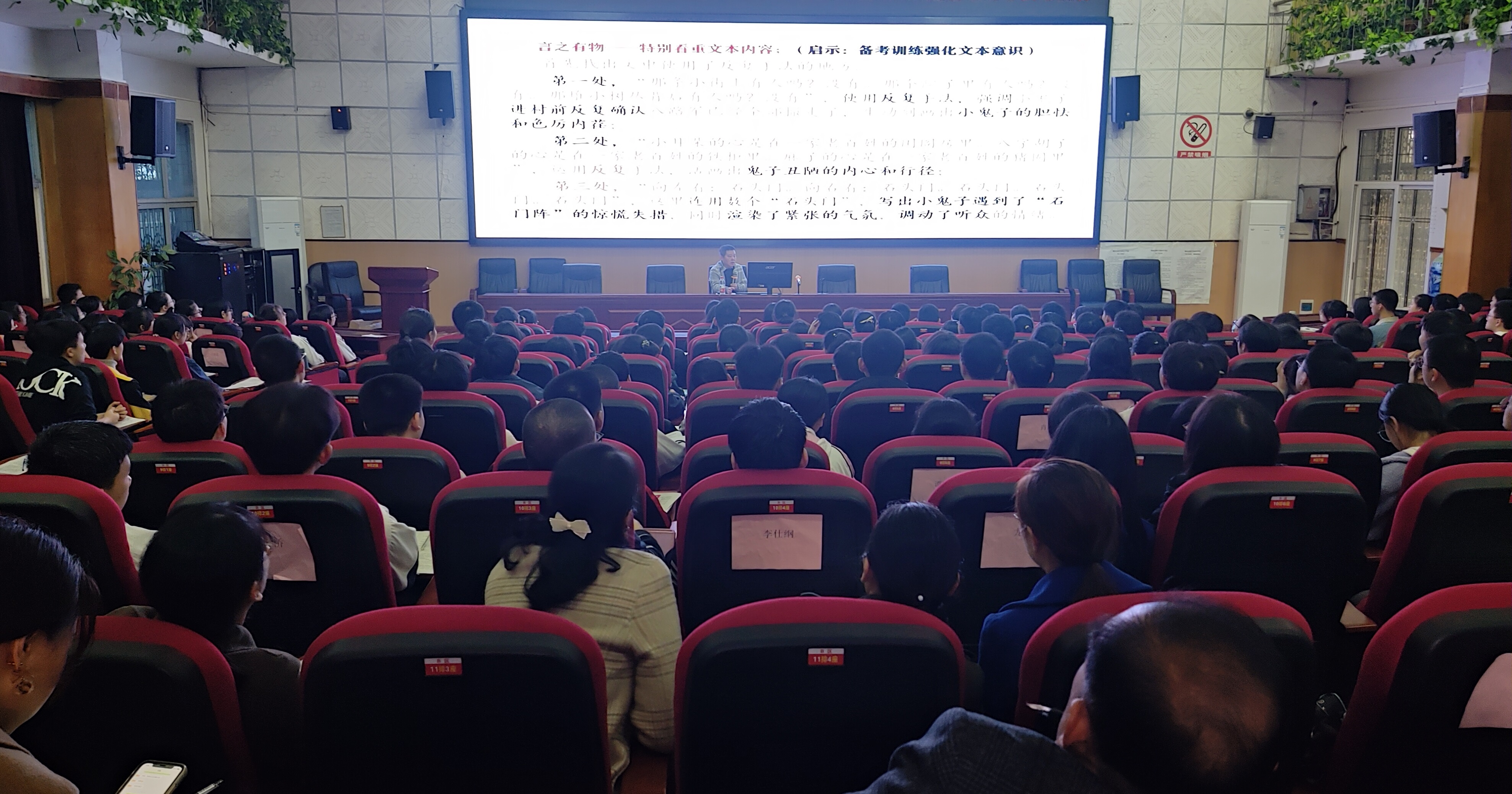 高三年級(jí)學(xué)生及全體語(yǔ)文老師到場(chǎng)聆聽(tīng)、學(xué)習(xí)。