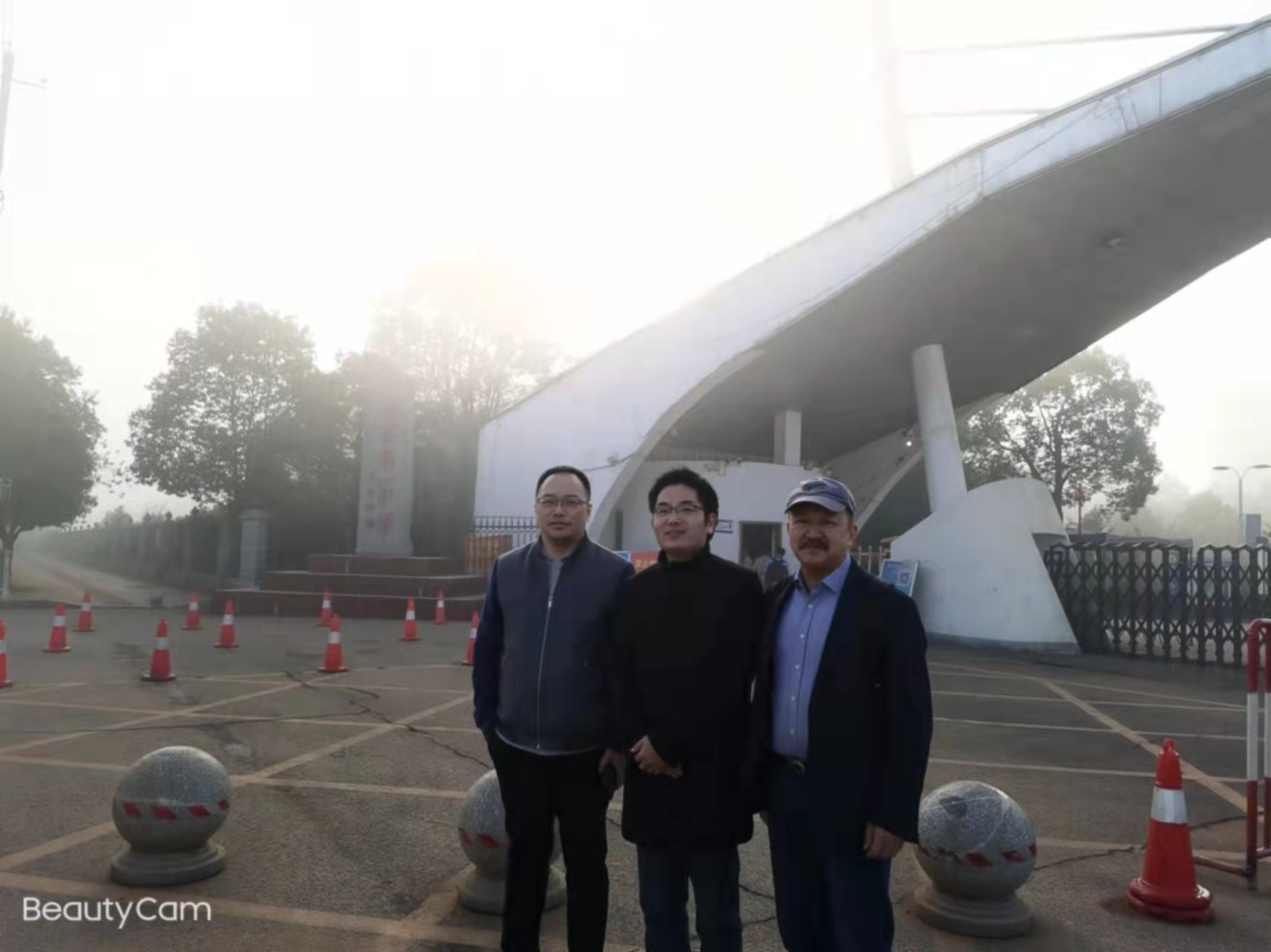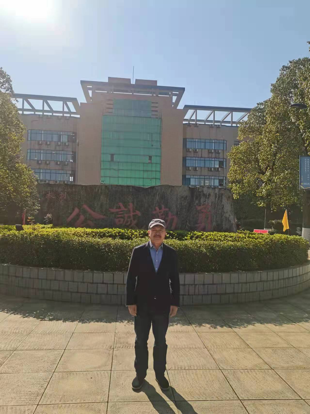 何總與教育專家在湘陰縣湘陰第一中學(xué)校門口合影